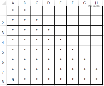 <!—dle_image_end—>Эмпирическим путем была выявлена данная доска. Сначала определяется граница, возникшая по диагонали, путем самого дальнего хода ладьи от изначального положения за 8 ходов. И затем убеждаемся, что ладья может остановиться везде в пределах этой границы. \\\"*\\\" отмечены возможные ячейки, в которых может остановиться ладья, сделав ровно 8 ходов, всего их 43.